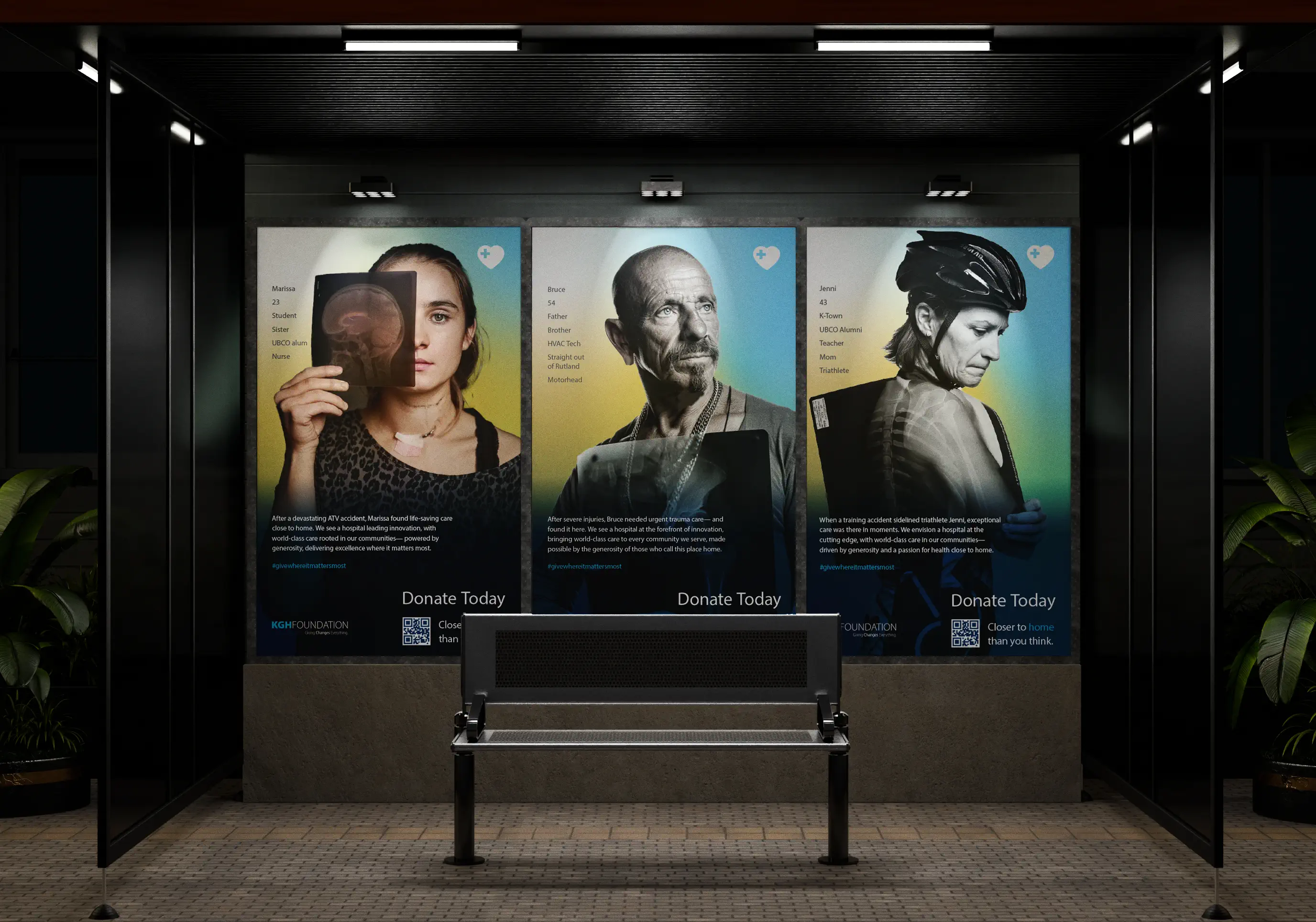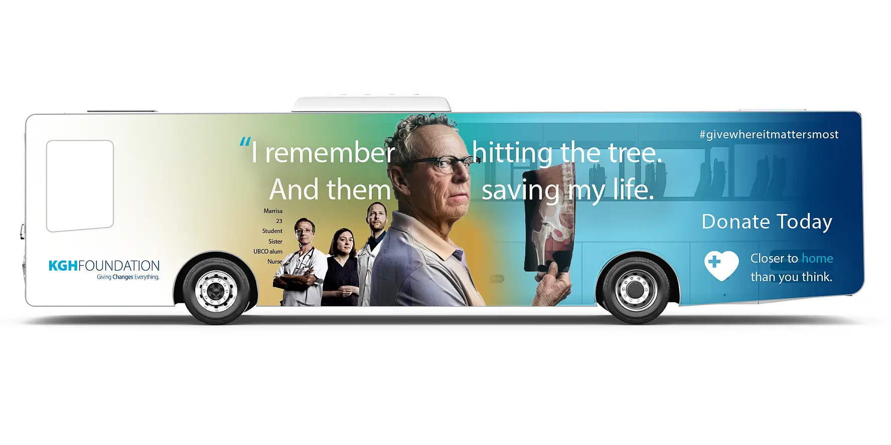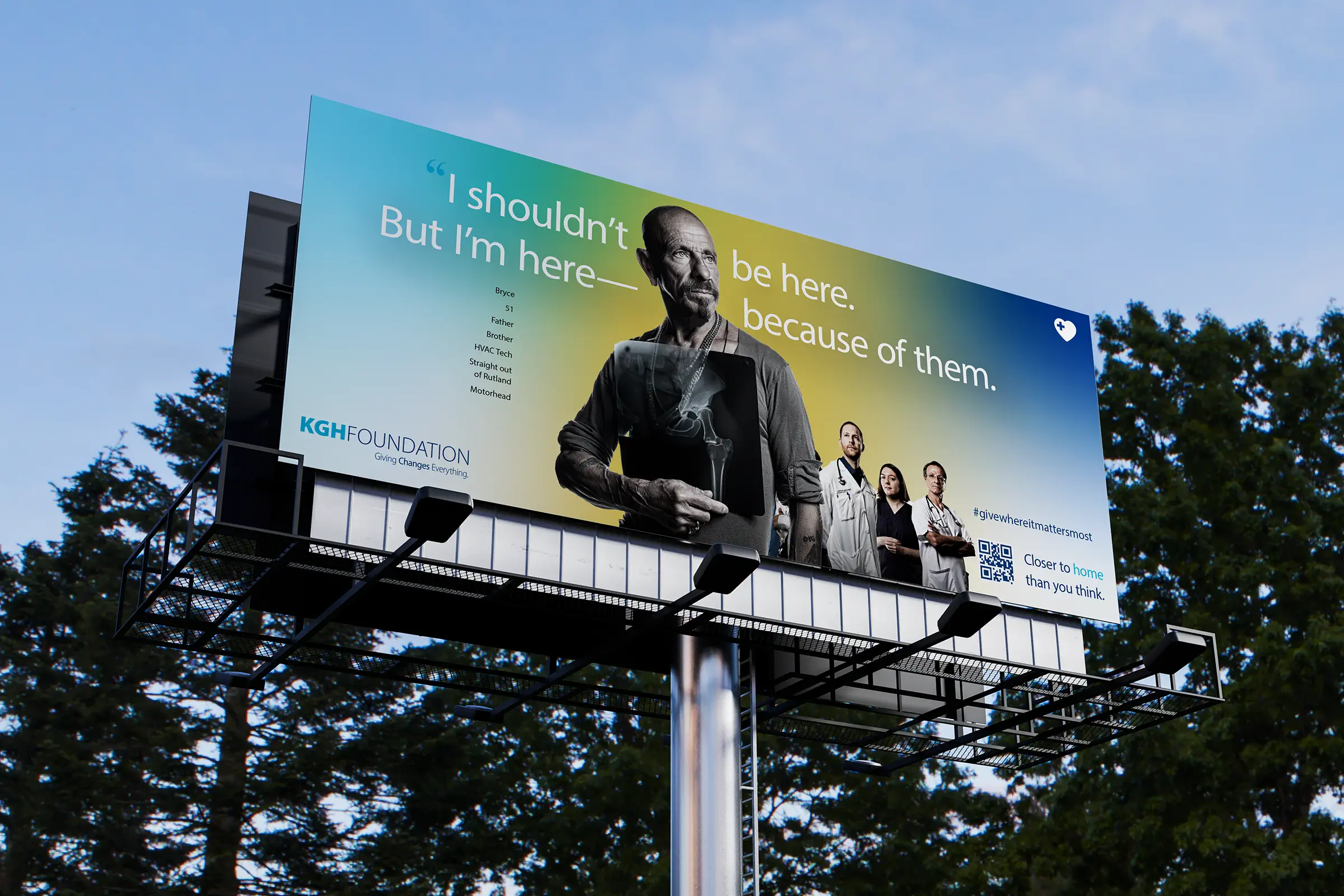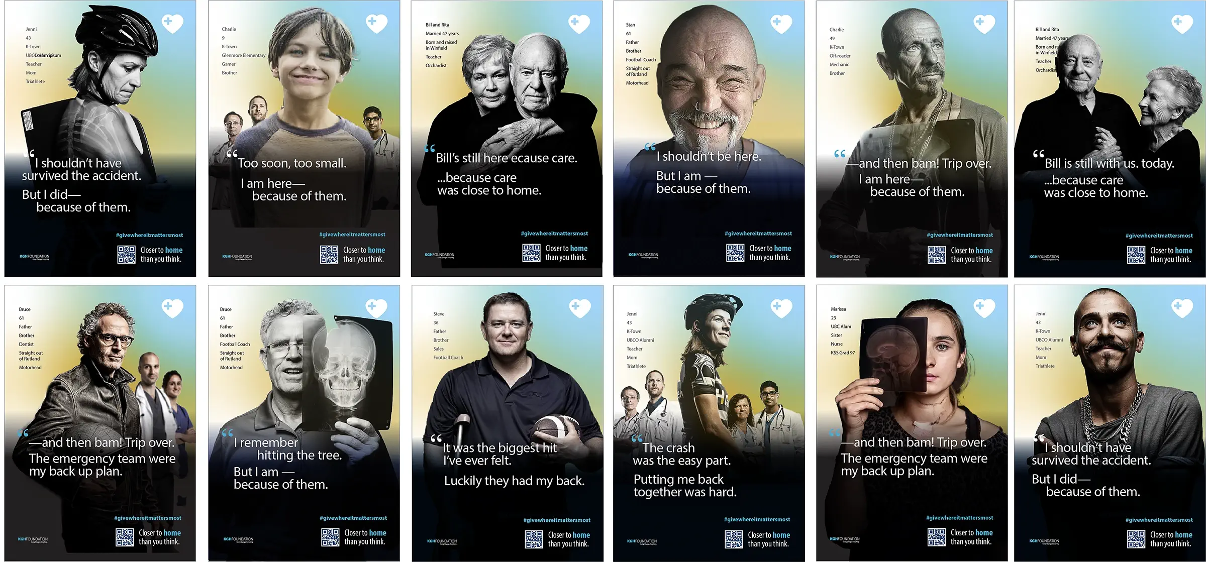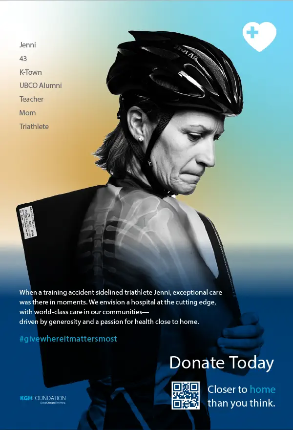 Fusebox developed "Closer to Home Than You Think" as a scalable campaign platform rather than a single-season execution. The strategy centered on first-person declarations that immediately captured attention and grounded the campaign in lived experience. Each execution paired a real community member with the clinicians responsible for their care, visually reinforcing the connection between donor generosity, medical expertise, and survival. A defining strategic layer was the deliberate use of hyper-local identifiers — Jenni, triathlete, teacher, UBCO alum. Bruce, dentist, straight out of Rutland, motorhead. The local football coach. Even the mayor of the city. These were intentional signals of place and belonging. They shifted the work from anonymous storytelling to community identification. A distinctive gradient visual system unified the executions across large-format outdoor and transit placements, digital and social media, print collateral, video applications, and direct-response executions with #givewhereitmattersmost.