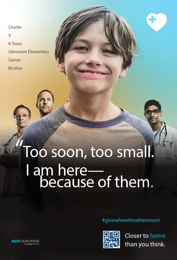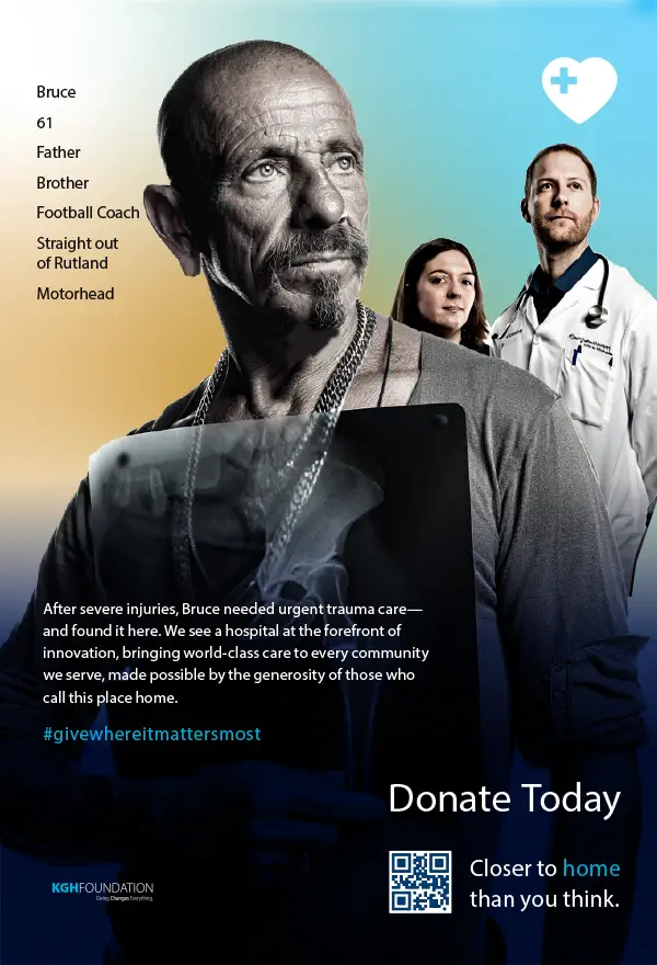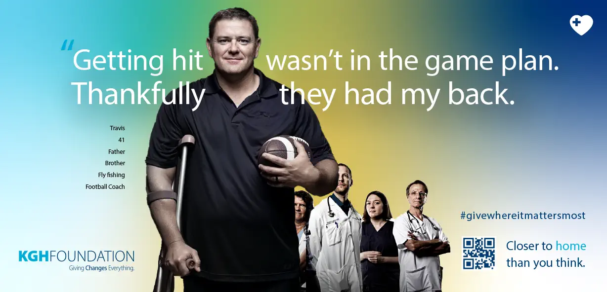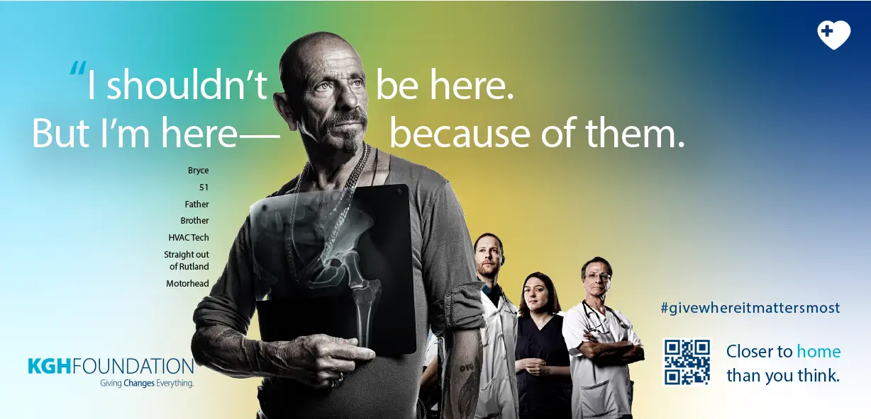 The result is a bold, emotionally direct campaign that positions the Emergency Department as immediate, essential, and rooted in this community. By combining powerful first-person storytelling with unmistakable local identifiers, the creative reframes emergency care as something delivered here — by clinicians and physicians whose expertise rivals major centres — not somewhere else. The work moves beyond conventional foundation messaging, grounding the campaign in recognition, proximity, and lived experience. Enthusiastically approved by the KGH Foundation, the platform establishes an original and strategically sound campaign architecture — one designed to sustain momentum, support multi-phase rollout, and evolve for years to come.